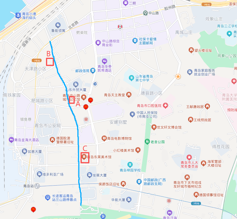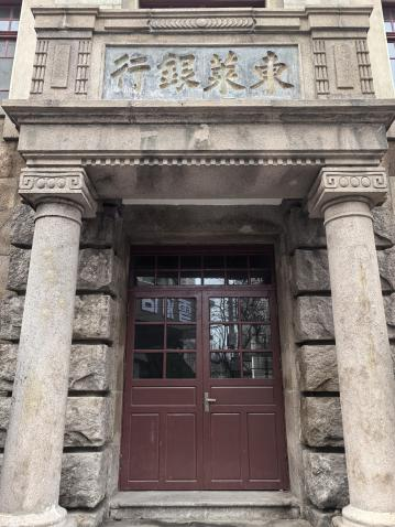 因河南路片区建筑多为20世纪30年代样式,该旧址曾一度难寻踪迹。青岛文史学者贺伟,从一张1914年前德国摄影师拍摄的春节老照片中发现了线索:照片中右侧现存的希姆森房产作为参照,左侧无意拍到的建筑,与东莱银行老照片比对完全吻合(见上图),位置在今天的河南路肥城路路口附近,大约为河南路23号。如今这座建筑虽在30年代翻修时贴了水刷石、加了山墙,但西立面、烟囱位置乃至“东莱银行”门头石条仍完好保留,默默见证着青岛本土金融资本的第一次发声。